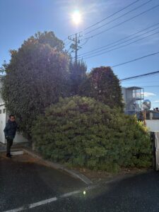 さいたま市 緑彩ガーデン株式会社です。今日から12月ですね、今年も1ヶ月になりました。毎年ご依頼の上尾市 三研光機様さまからのご依頼です。敷地内の剪定作業です。2022年に作業させて頂き3年ぶりの剪定作業です。