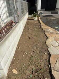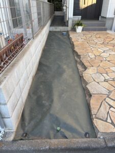 さいたま市 緑彩ガーデン株式会社です。防草シートを施工した後に砂利入れ作業を実施しました。作業前⇒防草シート⇒砂利入れ作業の写真です。