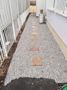 さいたま市 緑彩ガーデン株式会社です。本日で防草シートの上に砂利敷きを終了しました。敷地内も明るくなりました。